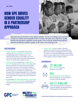 • Monitoring results: GPE collects access and learning data to identify and address specific needs and challenges of girls and boys, supporting governments in monitoring key areas relevant to gender inequalities in education.